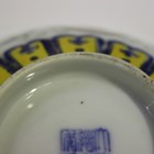 A Chinese famille verte porcelain circular bowl, Daoguang mark and probably of the period, painted and gilt with four circular panels enclosing characters, within a border of iron red lotus flowers on scrolling tendril stems, above a blue and yellow lappet border, underglaze blue six-character seal mark to base, height 5.3cm, diameter of rim 13.4cm.