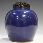 A Chinese powder blue glazed porcelain ginger jar, 18th century, height 20cm (minor faults and restoration), together with a carved and pierced hardwood cover.