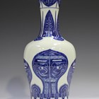 A Chinese blue and white porcelain vase, mark of Kangxi but probably 20th century, the high-shouldered baluster body beneath a slender neck and onion mouth, painted with taotie and lappet panels with ruyi head and dotted borders, underglaze blue painted six-character mark to base, height 42cm.