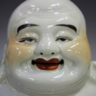A Chinese famille rose enamelled porcelain figure of a seated Buddha, 20th century, with five boy attendants, impressed seal mark to base, height 25.5cm (minor haircrack to belly), together with an oval wood stand, width 27.4cm.