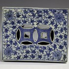 A Chinese blue and white porcelain pillow, late Qing dynasty, of rectangular form, painted to the four sides with chilong amidst peony flowers and scrolling leafy tendrils, one end pierced with a double cash motif, the other open, unmarked, length 28cm (repair to aperture end).