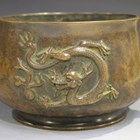 A Chinese brown patinated bronze bombé censer, the body cast in relief with opposing dragons, flanked by a pair of three-legged toad moulded handles, cast four-character seal mark to base, weight 3805g, height 11.4cm, width across handles 21.7cm.