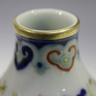 A Chinese doucai porcelain double gourd vase, mark of Qianlong but probably 20th century, both bulbs painted in underglaze blue, polychrome enamels and gilt with a formal design of bats and Buddhistic emblems amidst scrolling leafy tendrils and flowers, within ruyi head and key fret borders, underglaze blue seal mark to base, height 21.5cm.