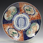A Japanese Imari porcelain circular dish, Meiji period, painted and gilt with panels of Buddhistic lions and squirrels amidst fruiting vines, diameter 41.2cm, together with three Chinese pottery figures, 20th century, comprising two fishermen and a sage, heights 28cm, 21cm and 15.5cm (minor faults).