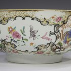 A Chinese famille rose Mandarin palette export porcelain vase, Qianlong period, the shouldered tapering body painted with opposing figural scenes reserved against a black, iron red and gilt 'Y' diaper ground, height 25cm, together with three similar export porcelain punch bowls, diameters 26cm and 26.5cm, and two teabowls (all with faults and repairs).