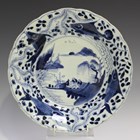 A Chinese blue and white porcelain circular dish, Kangxi period, the central panel painted with three fishermen seated at the shore side in a coastal landscape, the rim filled with four fish and weeds, diameter 27.7cm (repair to rim), together with three other later blue and white porcelain dishes, including one painted with four fish, crab and weeds, underglaze blue pseudo four-character mark of Kangxi to base, diameter 26cm (minor faults).