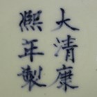 A Chinese blue and white porcelain punch bowl, mark of Kangxi but late 19th century, the exterior painted with panels of birds, figures, fish and flowers, the interior with figural panel beneath a butterfly and foliage rim, underglaze blue pseudo six-character mark to base, diameter 38.8cm (cracked and rivet repaired).