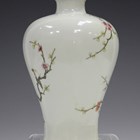A Chinese famille rose porcelain meiping vase, mark of Qianlong but late 20th century, the high-shouldered body painted with birds perched on flowering prunus blossom branches amidst peony, iron red painted seal mark to base, height 15cm.