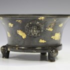 A Chinese gold splashed brown patinated bronze tripod censer, probably late Qing dynasty, the flared circular body with cast Buddhistic lion mask handles, on three scroll feet, cast seal mark to base, weight 717g, height 6.5cm, diameter 11.5cm (minor repairs to side).