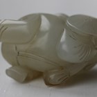 A Chinese jade carving of a boy, probably late Qing dynasty, modelled lying with a lotus leaf parasol, the stone of pale celadon tone, length 4.2cm, height 2.7cm.