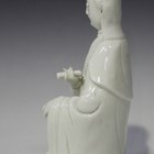 A Chinese blanc-de-Chine porcelain figure of Guanyin, Qing dynasty, modelled seated wearing a long robe and holding a scroll in her right hand, height 20.2cm.