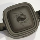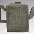 A Chinese black Yixing stoneware teapot and cover, 20th century, of rectangular form, each side decorated in relief with seven lines of text within a keyfret border, impressed seal mark to base, height 10.5cm, together with a Yixing stoneware teapot and cover of seated monkey form, impressed seal mark to base, height 11cm, another Yixing stoneware teapot and cover of rectangular bamboo moulded form, impressed seal mark to base, height 7.3cm, and a pair of Yixing stoneware wine cups.