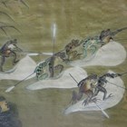 A Japanese painting on silk, Meiji period, depicting a frog battle on a lotus pond, using bulrush spears, 43cm x 84cm (some faults), framed and glazed.