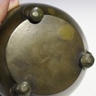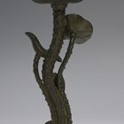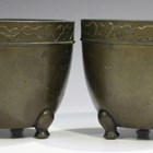 A pair of Chinese archaistic brown patinated bronze vases, late Qing dynasty, each globular body and flared neck cast with archaistic motifs, height 13cm, together with a small group of bronze items, including a pricket candlestick of lotus form, four-character mark to base, height 14cm, and a circular stand, incised mark to underside rim, diameter 11cm.