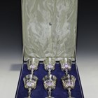 A set of six Elizabeth II silver goblets, each tapered bowl with band of ovals and strapwork, gilt interiors, on a knop stem and circular foot, London 1977 by Harrods Ltd, total weight 1325g, each height 15.7cm, within original Harrods fitted case.