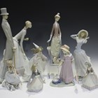 Eight Lladro porcelain figures, comprising Couple with parasol, No. 4563 (lacking parasol), Girl with toy wagon, No. 5044, Jolie, No. 5210, Angela, No. 5211 (lacking parasol), Chit-Chat, No. 5466, Fairy Godmother, No. 5791, Woman, No. 4761, and Spring Breeze, No. 4936 (minor restoration).