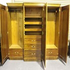 A mid-Victorian figured pale mahogany three-section wardrobe, the mirrored door enclosing sliding trays and drawers, height 211cm, width 196cm, depth 68cm (cornice altered).