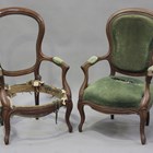 A late 19th century French walnut showframe salon settee, height 99cm, width 188cm, depth 90cm, together with a pair of matching armchairs and three side chairs (faults).