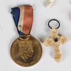 A small group of collectors' items, including a 19th century tortoiseshell card case, a bone pendant cross inset with a Stanhope lens, length 4cm, a Canton ivory shoehorn and three Victorian pewter tankards.