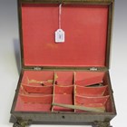 A Regency penwork workbox of shallow sarcophagus form, the lid decorated with a chinoiserie reserve, raised on pressed brass feet, height 11.5cm, width 33cm (faults), together with a Victorian papier-mâché tray, painted with birds and flowers, width 47cm (faults).