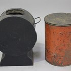 A late Victorian toleware 'Golden Syrup' dispenser, the circular front painted with a classical ruin, height 36cm, width 28cm, together with a toleware 'Patna Rice' tin, height 30cm.