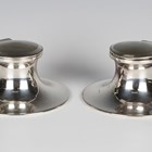 A pair of early 20th century Elkington plated capstan inkwells of shipping interest, each hinged lid engraved with 'The Royal Mail Steam Packet Company' crest, height 7cm.
