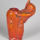A 20th century Chinese carved horn libation cup, height 13.5cm, a South-east Asian red hardstone and bone fly whisk, another fly whisk, a carved snuff bottle, modelled with a climbing figure, 9cm, and an engraved brass box.