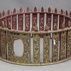 A 20th century Burmese Kyi-Waing gong frame, each section carved and pierced with foliage, and applied with mirrored panels, height 59cm, diameter 133cm. Note: the Kyi-Waing is part of the Hsaing Waing, a traditional Burmese musical ensemble, and would have originally held a series of gongs to the interior.