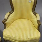 A pair of 20th century French beech showframe fauteuil armchairs, upholstered in yellow striped damask, height 90cm, width 66cm, depth 65cm.
