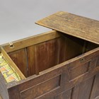 A George III oak coffer, the removable lid above a panelled front, on stile supports, height 88cm, width 120cm, depth 49cm (alterations).