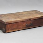 An early 20th century oak under-bed blanket box with hinged lid and four turned wheels, height 27cm, length 123.5cm, depth 62cm.