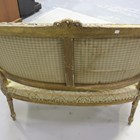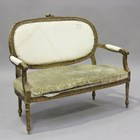 An early 20th century Louis XVI style gilt painted showframe salon settee, height 96cm, width 119cm, depth 65cm.