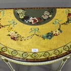 A pair of modern George III style satinwood and painted demi-lune console tables, each top decorated with floral swags and peacock feathers within crossbanded borders, height 81cm, width 99cm, depth 46cm.