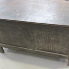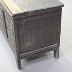 An 18th century oak panelled coffer with later carved decoration, height 67cm, width 106cm, depth 49cm (faults).
