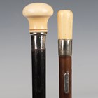 A late 19th century ebonized walking cane with ivory handle and plated collar, length 89cm, together with a hardwood cane with ivory handle, length 91.5cm.