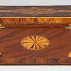 A George III mahogany tea caddy, the hinged lid inlaid with an oval panel of sinuous foliage, the front and sides with fan paterae and star motifs, all within crossbanded and chequered borders, width 24.5cm (some restoration to interior).