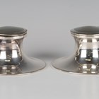 A pair of early 20th century Elkington plated capstan inkwells of shipping interest, each hinged lid engraved with 'The Royal Mail Steam Packet Company' crest, height 7cm.