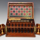 A late Victorian mahogany cased and brass bound games compendium, the hinged lid and front enclosing a Staunton chess set, leather board, draughts, cribbage board, steeple chase horses and bezique markers, width 33cm.