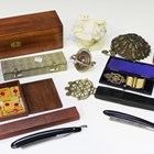 A mixed group of collectors' items, including a Victorian mahogany box, width 25cm, a small alabaster tazza, a mahogany cased 'motor puzzle', a Cross ballpoint pen and matching propelling pencil, and a gyroscope.