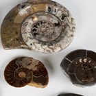 A selection of fossil specimens, including orthoceras in black marble, four ammonites, a cross-section of petrified wood and a tooth.