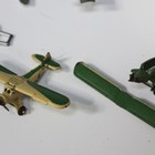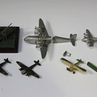 A small collection of Dinky Toys aircraft, comprising a No. 63 Mayo composite aircraft, boxed, box dated '1-40', a No. 62b Blenheim bomber, a No. 60s medium bomber, a French No. 60c Henriot H180T, a No. 60b Potez 58 and a modern die-cast model of a biplane (playwear, paint chips and faults, box and lid creased, torn and scuffed).