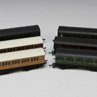 A collection of Grafar gauge OO carriages in Southern, LMS and LNER liveries.