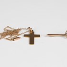 A late Victorian 15ct gold pendant cross, Chester 1894, weight 2.8g, length 3.4cm, with a gold neckchain on a cylindrical clasp, detailed '9ct', weight 1.2g, length 45.5cm, a 9ct gold ring in a beaded and interwoven design, ring size approx O, and a gold and seed pearl set bar brooch, detailed '9ct', weight 4.5g, width 5cm.