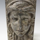 An early 20th century carved hardstone architectural element, possibly a keystone, finely modelled with a female mask, bearing incised signature 'G. Duport' to one side, height 28cm, width 20cm, depth 17cm.