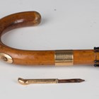 A mid-20th century gold mounted umbrella by Brigg of London, the handle fitted with a gold mounted pencil, length 94cm, together with a silver mounted leather walking cane, fitted with an aluminium and brass pull-out horse measure with folding spirit level, London 1947, length 93cm.