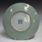 A Chinese Canton famille rose enamelled celadon ground porcelain circular dish, mid to late 19th century, decorated with butterflies flying amidst fruit and flowers, underglaze blue pseudo seal mark to base, diameter 26cm.