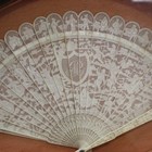 Two Chinese export ivory brisé fans, mid-19th century, the guards carved in relief with figures, one with twenty sticks carved in low relief and pierced with a shield shaped monogram panel within a surround of figures, length 18cm, the other carved in low relief and pierced with village scenes of figures, pavilions and trees, length 18.5cm, each framed in a glazed display case.