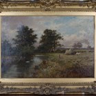 Manner of Henry H. Parker - Harvest Scene, late 19th century oil on canvas, bears signature and inscription verso, 60cm x 90cm, within a swept gilt composition frame of wide and deep section with foliate scroll crestings.