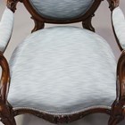 A near pair of mid-Victorian walnut showframe armchairs with finely carved decoration, each upholstered in blue fabric, on cabriole legs, height 100cm, width 73cm, depth 77cm.