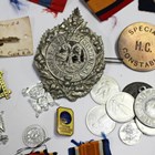 A 1914-18 British War Medal and 1914-19 Victory Medal to '49092 Pte.A.Simons. The Queens R.', a Burma Star, an enamelled medal commemorating 'The Royal Scots 1633-1983', with an associated case, a large uni-faced base white metal medallion depicting Napoleon, a quantity of medal ribbons, a Royal Artillery sweetheart brooch and a group of further items of mostly military interest.